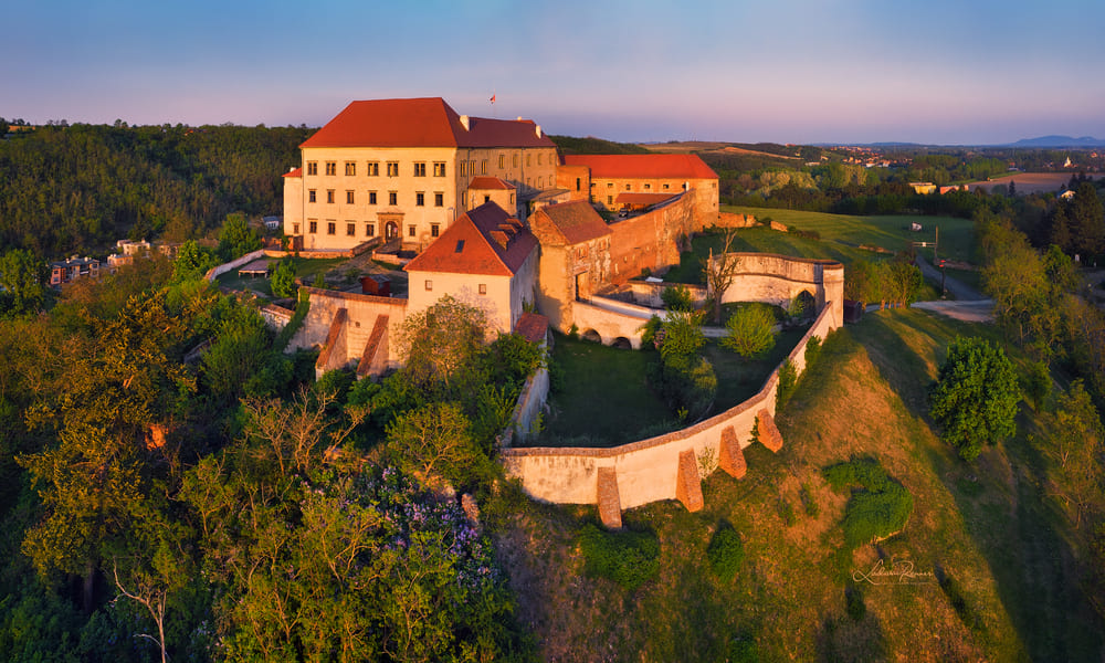Он расположен на холме над рекой Йиглава, недалеко от руин монастыря Rosa Coeli.