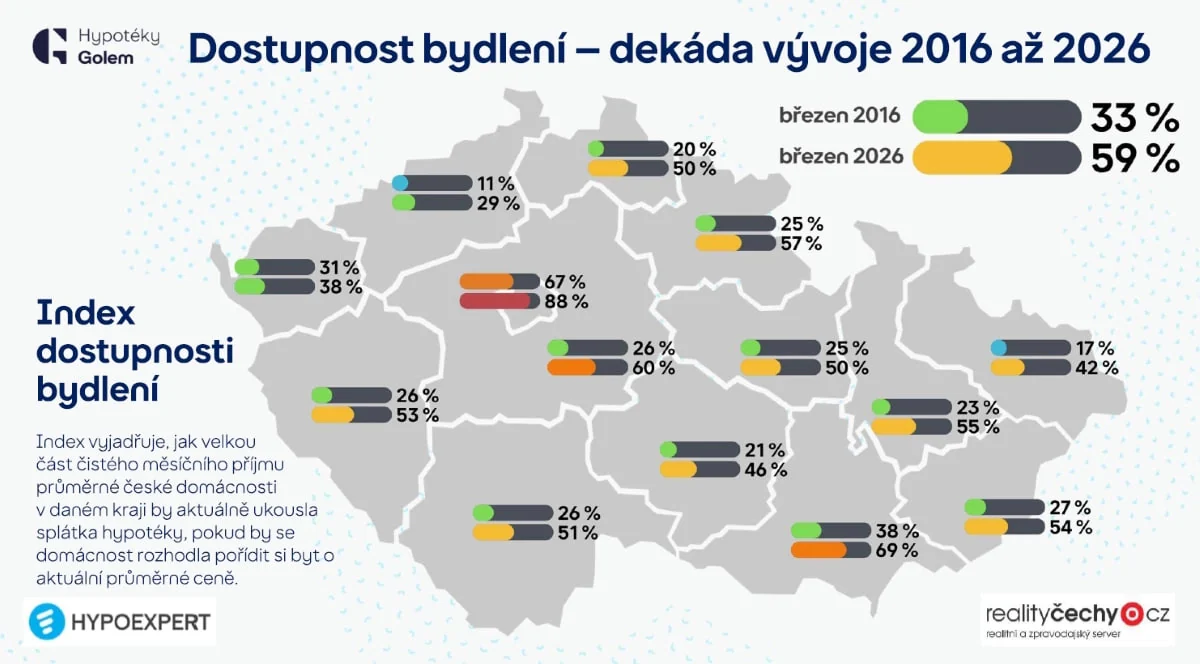 Сравнение доступности жилья по краям Чехии в 2016 и 2026 году