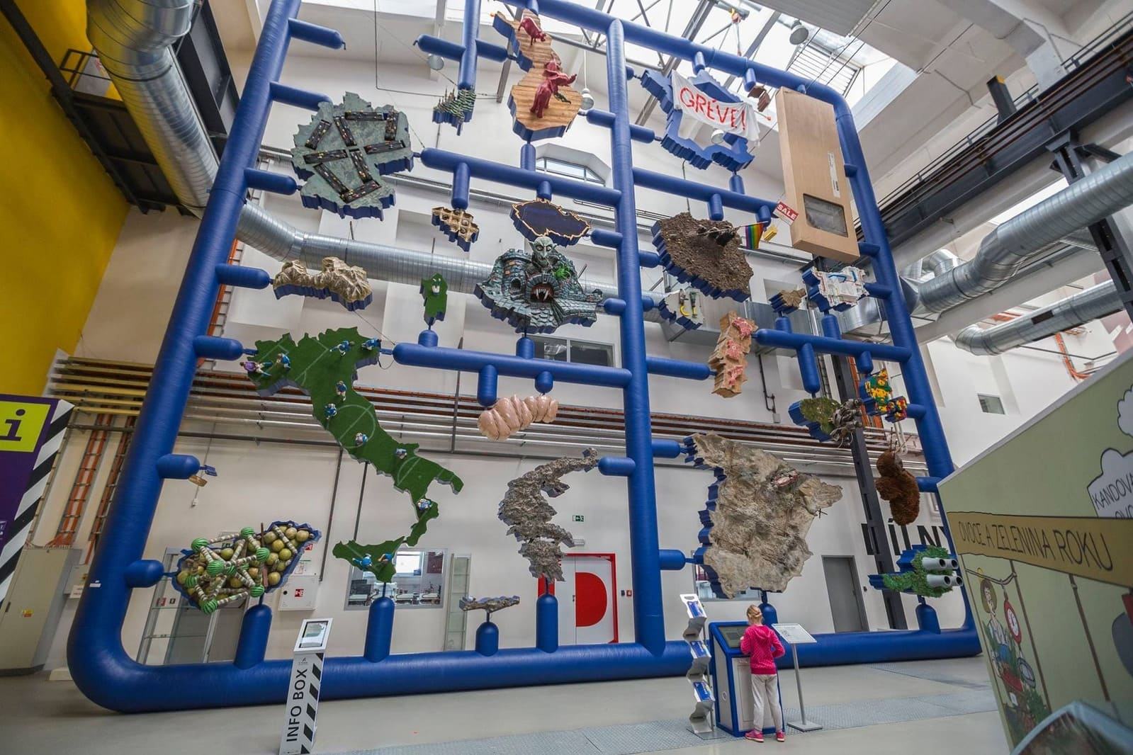 На синем квадрате, собранном из труб, автор расположил элементы в форме странЕвропы в их "истинном", по его мнению, обличии. Например, вместо Швеции онразместил коробку из Икеи, над Румынией грозно возвышался Дракула, на Германиибыло изображение свастики и так далее. Великобританию он и вовсе решил туда невключать, что вызвало шум не только во время открытия инсталляции, но и посленачала брексита, поскольку получилось, что Черны предугадал последующие события.