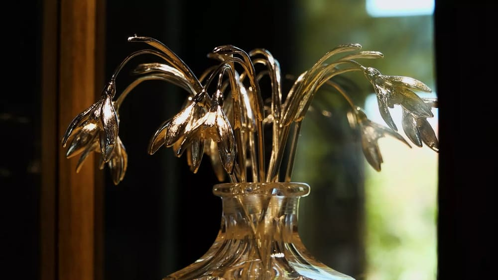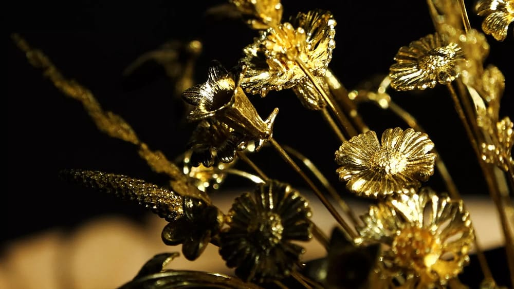Букет состоит из 118 отдельных золотых частей (24 карата) общим весом 739 граммов. Изготовление заняло около месяца. Букет помещен в черную вазу Moser.