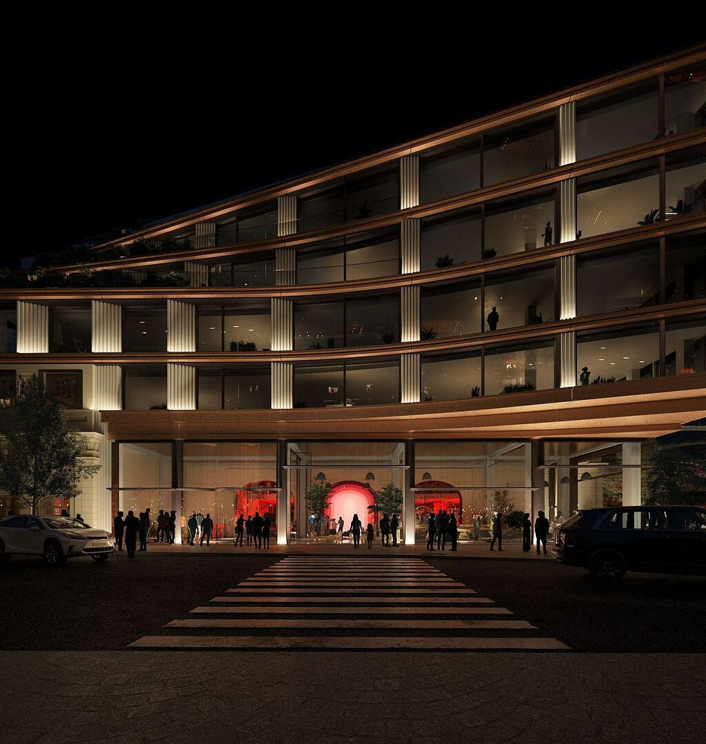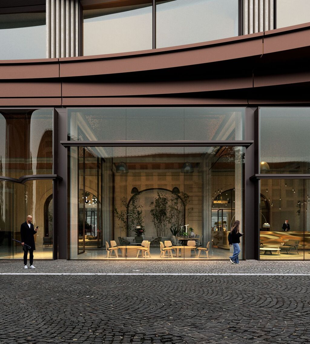 Это карнизы, глубина фасадных конструкций и характерные фактуры. Дизайн переводит их на современный архитектурный язык и следует окружающему ритму и масштабу.