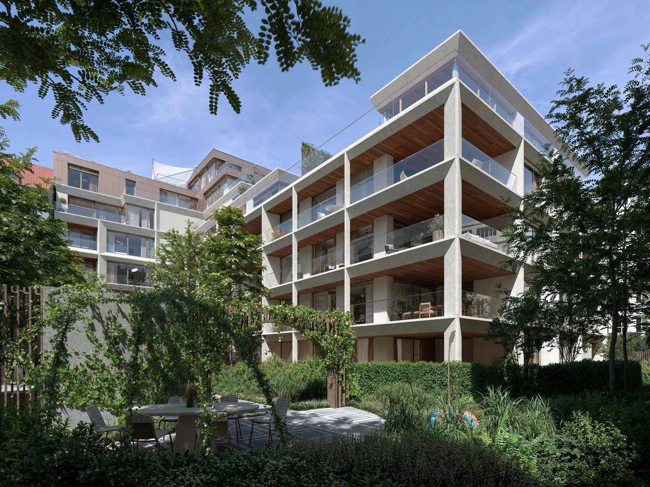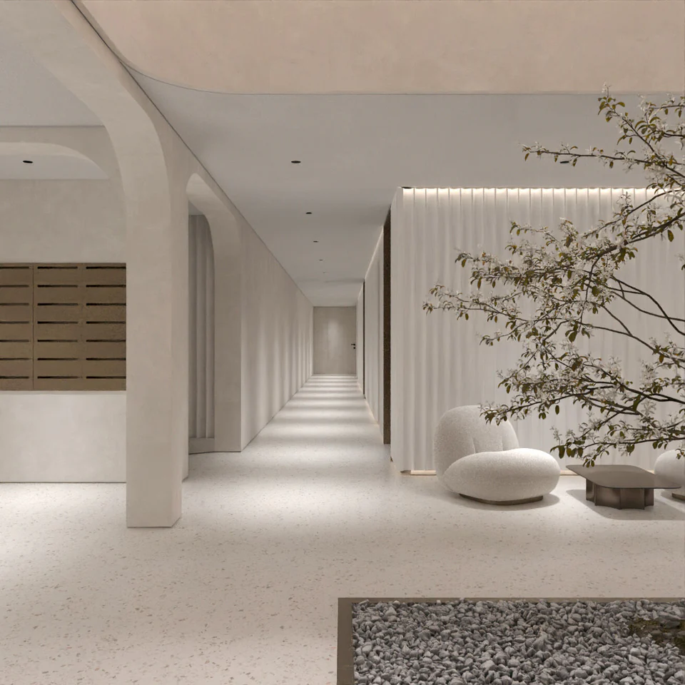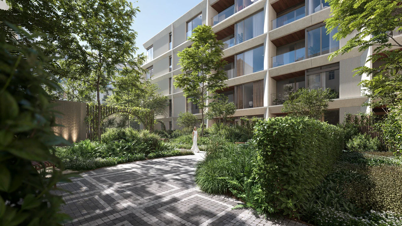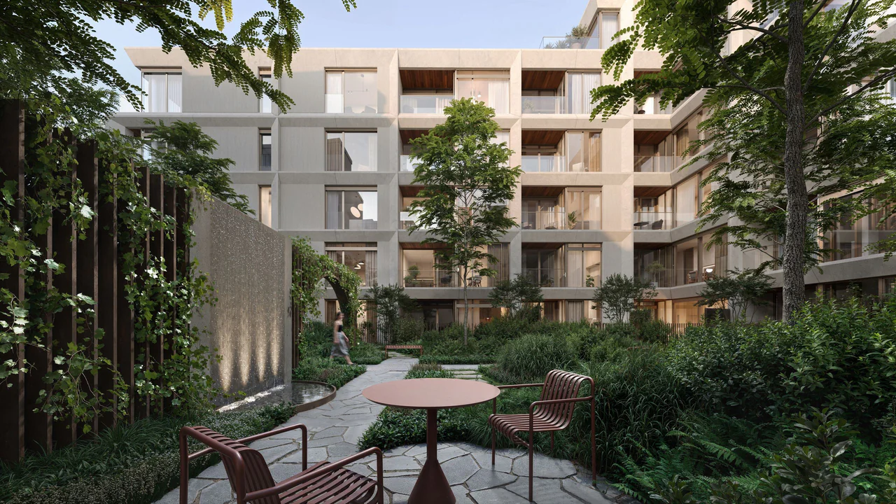 Особая гордость проекта — внутренний двор с озеленением. Его концепция вдохновлена историческими монастырскими садами, которые когда‑то располагались в этой части города.