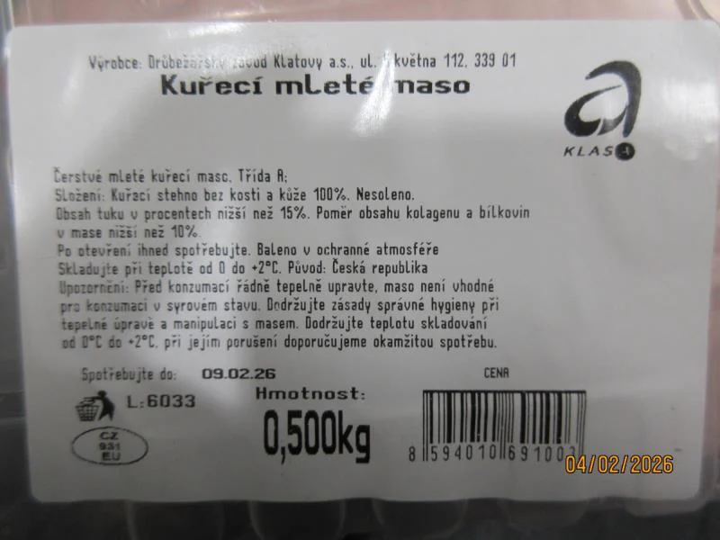 Kaufland: куриный фарш, 0,5 кг, срок годности — 09.02.2026, производитель — Drůbežářský závod Klatovy. Обнаружены бактерии Salmonella infantis.